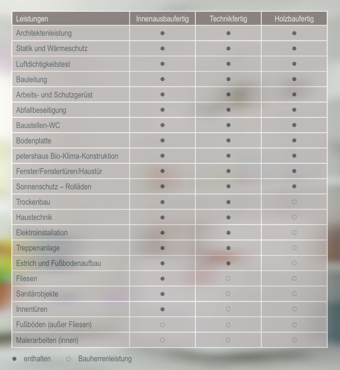 In der Grafik können Sie anhand der Übersicht einen detaillierten Überblick über unsere verschiedenen Ausbaustufen erhalten, die Sie als Bauherr bei petershaus wählen können.
