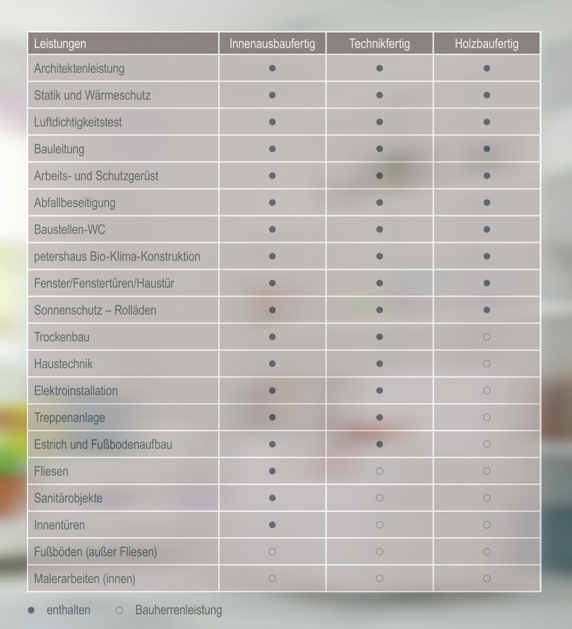 In der Grafik können Sie anhand der Übersicht einen detaillierten Überblick über unsere verschiedenen Ausbaustufen erhalten, die Sie als Bauherr bei petershaus wählen können.